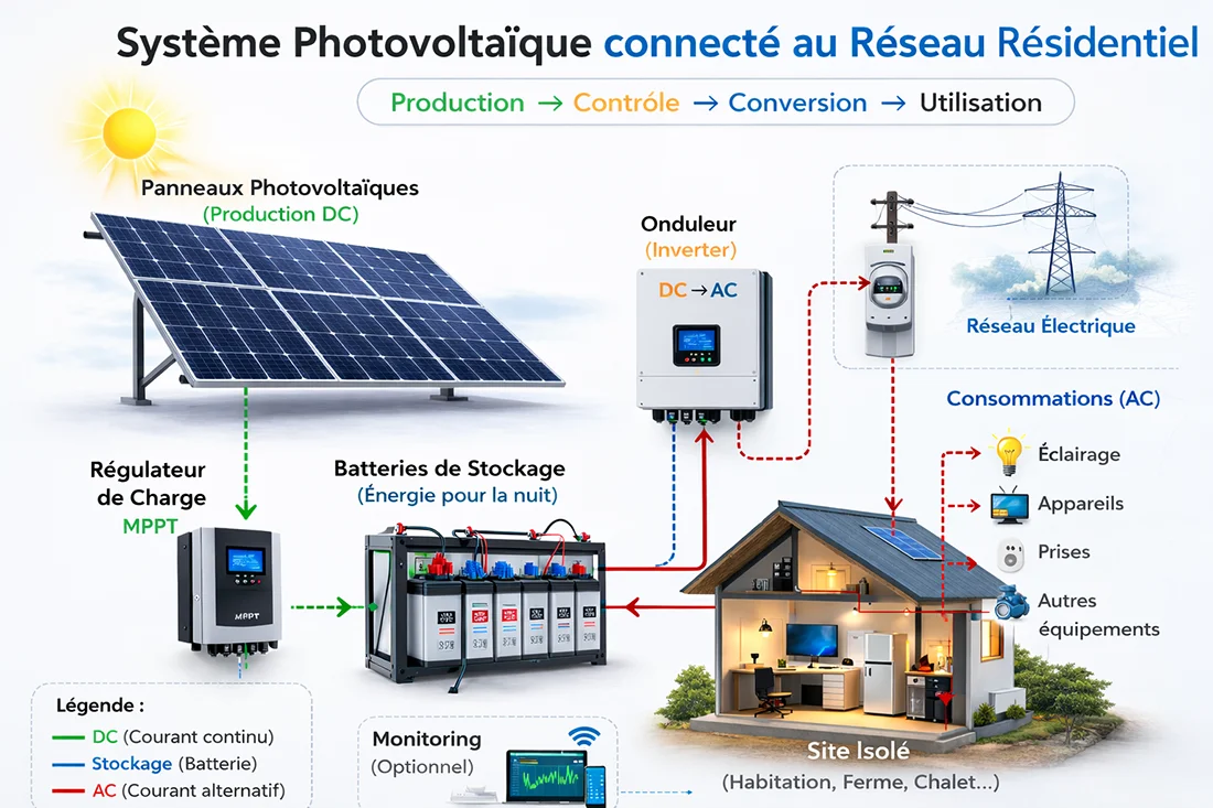 Un système photovoltaïque connecté au réseau industriel est une installation solaire de moyenne ou grande puissance destinée aux usines, ateliers, entrepôts ou bâtiments professionnels. L’énergie produite alimente en priorité les équipements industriels, et le surplus peut être injecté dans le réseau public selon la réglementation en vigueur.